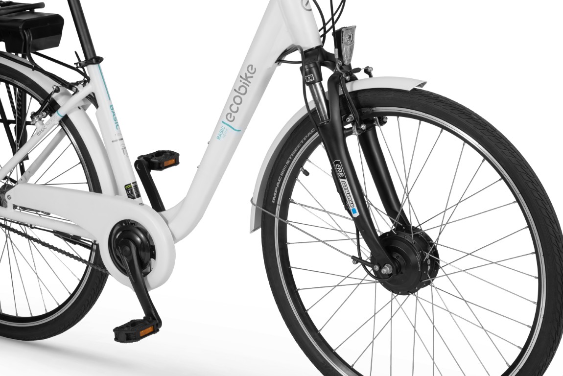 Ecobike Basic już swoją nazwą zdradza, że jest podstawowym e-bikiem w naszej ofercie. Jego system elektrycznego wspomagania rozwija moc 250W i pozwala mknąć przez miasto 25 km/h. Silnik mieści się w piaście tylnego koła, a bateria na bagażniku. Obsługę wspomagania umożliwia klasyczny wyświetlacz LED – ergonomiczny i łatwy w użytkowaniu.
