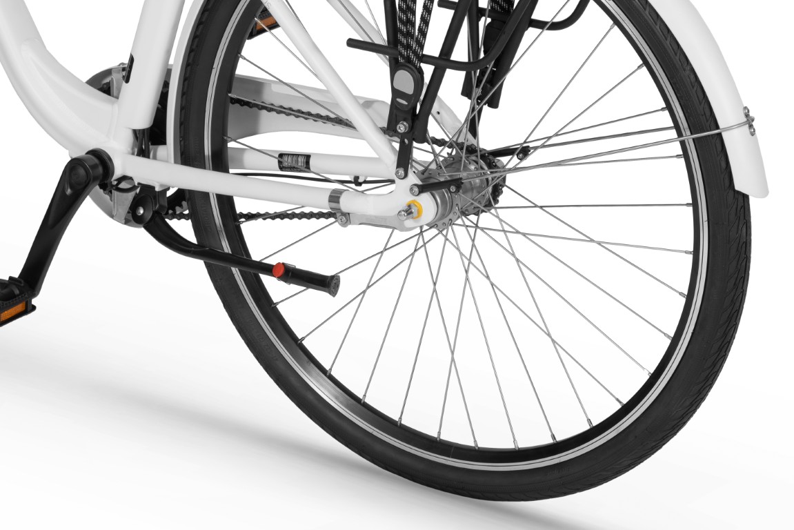 W tej wersji silnik zainstalowaliśmy w przedniej piaście, aby w osi tylnego koła mogła znaleźć się niezawodna przerzutka Nexus 3, która pozwala na zmianę przełożeń nawet podczas postoju, co świetnie sprawdza się wśród miejskich skrzyżowań z sygnalizacją świetlną. Atutem, który docenisz najbardziej, jest jej odporność na wszelkie warunki, które możesz napotkać na swojej drodze — bez znaczenia, czy będą to kałuże, czy piach. Możesz cieszyć się wygodą, jaką daje i zapomnieć o naprawach, których bardzo długi czas nie będzie wymagać.